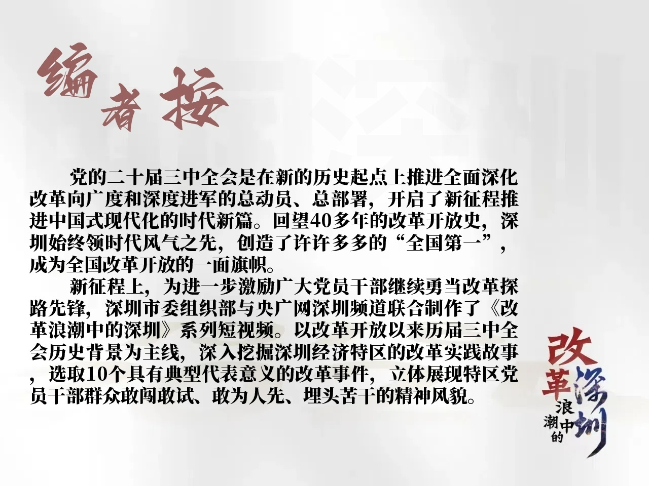 央广网深圳10月21日消息(记者 荣冀晴)10月21日,中共深圳市委组织部与央广网深圳频道联合出品的系列短视频作品《改革浪潮中的深圳》推出第八集《“标准+”:党建标准化 花开满园春》。本集讲述了深圳创新推行社区党建标准化,采取一系列前所未有的改革措施,逐步建立起社区党委领导,居委会、工作站、社会组织、股份公司、驻社区单位等积极参与和有序运转的城市基层治理架构,推动全市基层党建工作从“花开几枝”步入“满园芬芳”。
