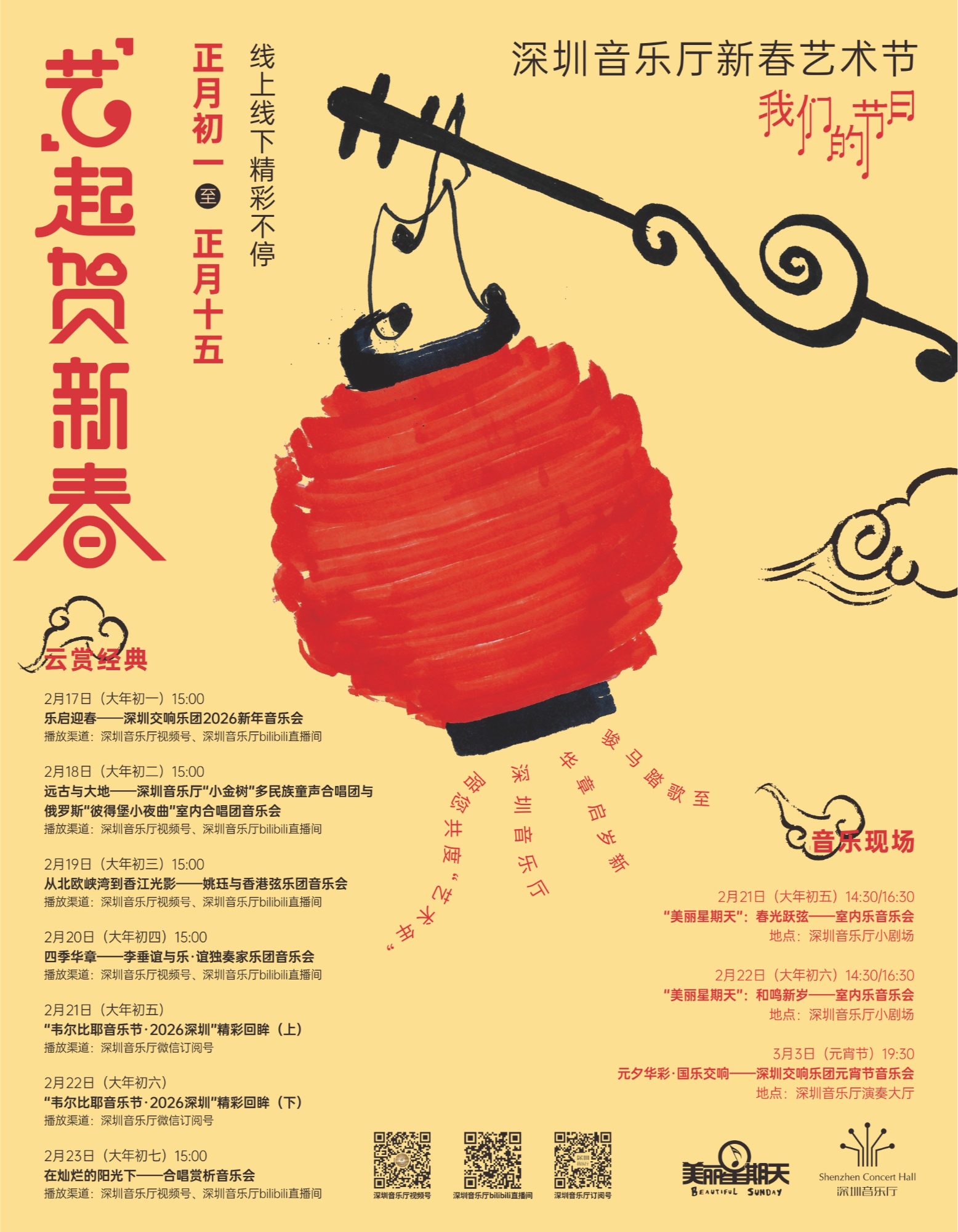 除了大银幕,深圳音乐厅也推出“新春艺术节”,线上线下多场演出陪伴观众开启新一年。其中汇聚了中西合璧的多元演出形式:既有名家名团演绎的交响盛宴,用恢弘乐章奏响新年祝福;也有极具岭南风情的民族音乐会,以悠扬粤韵诉说城市温情。